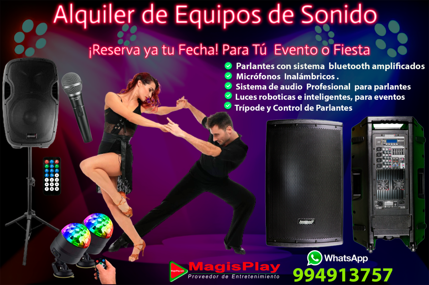 MagisPlay te brindamos el Asesoramiento Integral para que alquiles el Equipo de Sonido profesional para eventos y el Juego de Luces para fiesta que se adecua a tu espacio, nos respalda el testimonio de nuestros clientes y una amplia Experiencia en el manejo de eventos sociales y corporativos.